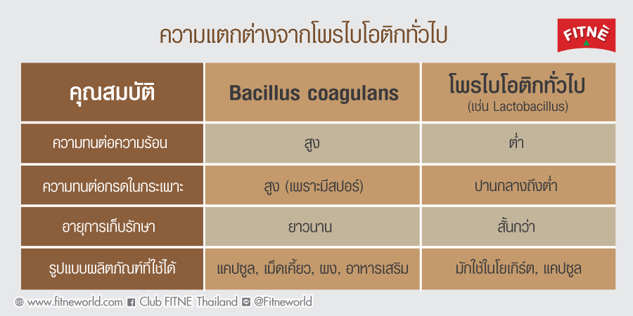 - บาซิลลัส โคแอกกูแลน (Bacillus coagulans) เป็นแบคทีเรียที่สร้างสปอร์จึงมีความทนทานสูง และสามารถผ่านกรดในกระเพาะอาหารไปถึงลำไส้ได้